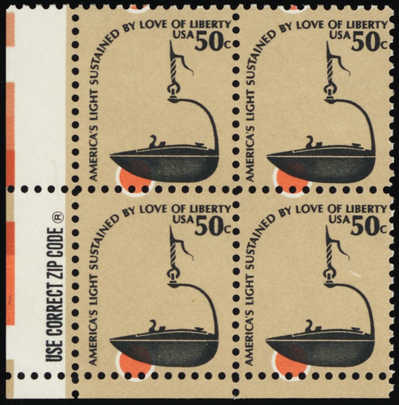 1608, Mint NH 50¢ - Orange Color Shifted Way Down Error Zip Block - Stuart Katz