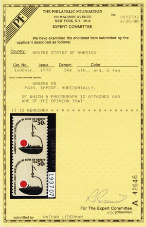Due to the high cost of obtaining certificates we will only refund the cost of the stamp and not the cost of the certificate for stamps that sell for less than $250 that come back with a negative certificate. Stamps that sell for above $250 will receive a full refund for both the price of the stamp and cost of the certificate if it should come back not as described. For U.S. stamps only certificates from either APS, PSE or from the Philatelic Foundation are accepted, however "graded" certificates or "encased" items are not accepted.