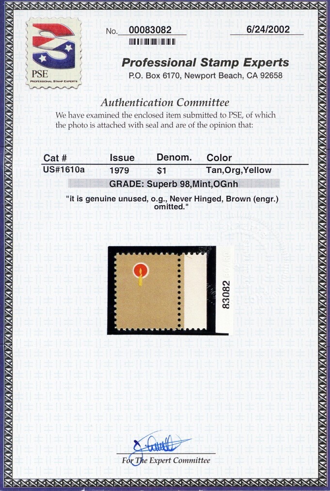 1610, Mint NH $1 Brown Color Omitted PSE Graded 98 Cert - Stuart Katz