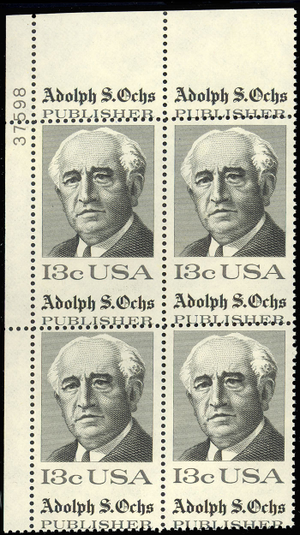 1700 Misperforated ERROR Plate Block - Unique 13¢ Adolph S. Ochs - Stuart Katz