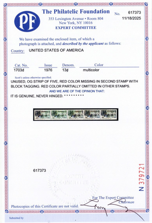 1703d, Mint NH 13¢ Red Color Omitted In Strip With PFC - Stuart Katz