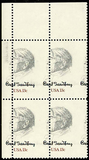 1731, MNH 13c Sandburg - AMAZING MISPERFORATION PL# BLOCK OF FOUR - Stuart Katz
