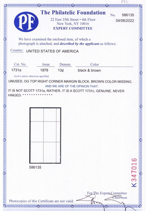 1731c, Mint VF NH ALL Colors Omitted Error Block - PFC Cert * Stuart Katz