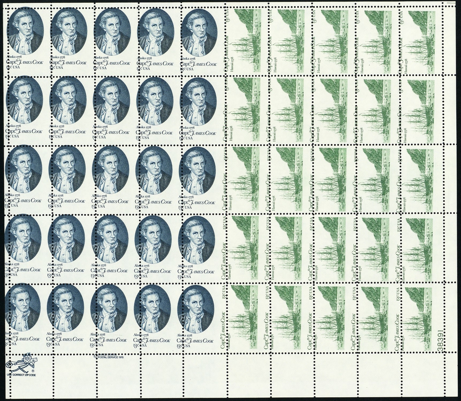 1732-33, Misperfed James Cook 13¢ Error Sheet of 50 - Stuart Katz