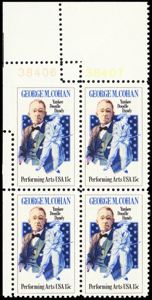 1756, Dramatic Fold Over ERROR Plate Block 15¢ George Cohan MNH - Stuart Katz