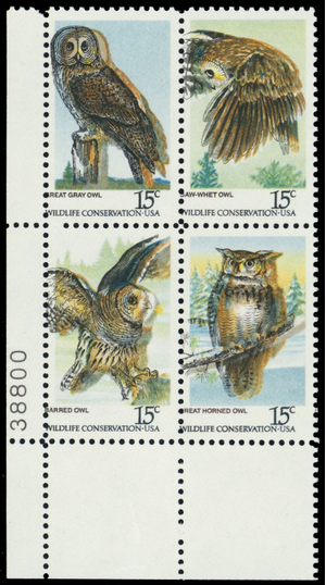 1763a, Mint NH 15¢ Large Color Shift Error Plate Block Owls - Stuart Katz