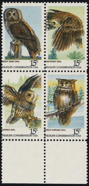 1763a, MNH 15¢ Nice Color Shift Freak Error Block of Owls - Stuart Katz