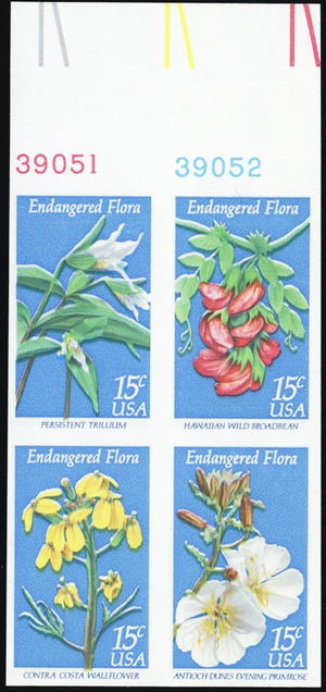 1786b, 15¢ Flowers Imperforate Error Block of Four With PL# - Stuart Katz