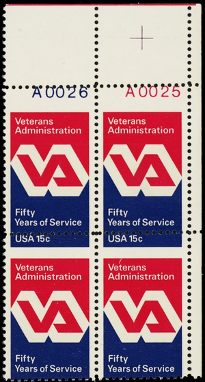 1825, Misperforated ERROR Plate Block 15¢ Veterans Stamps - Stuart Katz