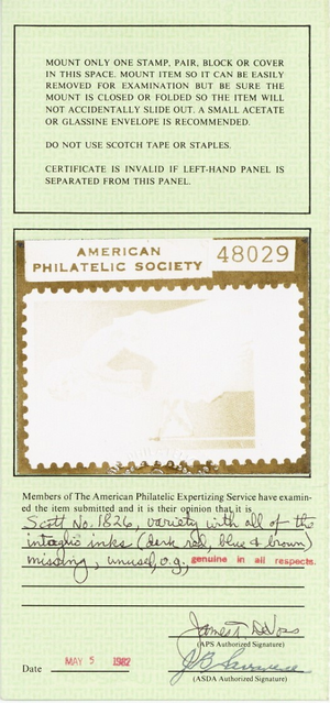 Due to the high cost of obtaining certificates we will only refund the cost of the stamp and not the cost of the certificate for stamps that sell for less than $250 that come back with a negative certificate. Stamps that sell for above $250 will receive a full refund for both the price of the stamp and cost of the certificate if it should come back not as described. For U.S. stamps only certificates from either APS, PSE or from the Philatelic Foundation are accepted, however "graded" certificates or "encased" items are not accepted.