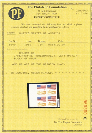 Due to the high cost of obtaining certificates we will only refund the cost of the stamp and not the cost of the certificate for stamps that sell for less than $250 that come back with a negative certificate. Stamps that sell for above $250 will receive a full refund for both the price of the stamp and cost of the certificate if it should come back not as described. For U.S. stamps only certificates from either APS, PSE or from the Philatelic Foundation are accepted, however "graded" certificates or "encased" items are not accepted.