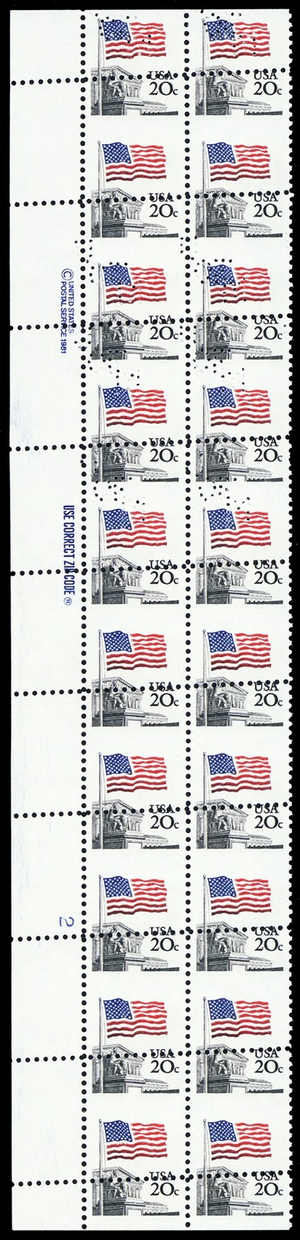 1894, MNH 20¢ Misperforated Freak Error Part Perfin Block of 20 - Stuart Katz