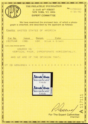 Due to the high cost of obtaining certificates we will only refund the cost of the stamp and not the cost of the certificate for stamps that sell for less than $250 that come back with a negative certificate. Stamps that sell for above $250 will receive a full refund for both the price of the stamp and cost of the certificate if it should come back not as described. For U.S. stamps only certificates from either APS, PSE or from the Philatelic Foundation are accepted, however "graded" certificates or "encased" items are not accepted.
