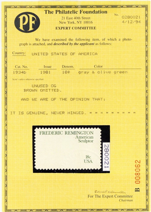 Due to the high cost of obtaining certificates we will only refund the cost of the stamp and not the cost of the certificate for stamps that sell for less than $250 that come back with a negative certificate. Stamps that sell for above $250 will receive a full refund for both the price of the stamp and cost of the certificate if it should come back not as described. For U.S. stamps only certificates from either APS, PSE or from the Philatelic Foundation are accepted, however "graded" certificates or "encased" items are not accepted.