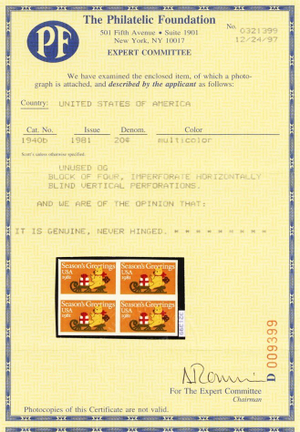 Due to the high cost of obtaining certificates we will only refund the cost of the stamp and not the cost of the certificate for stamps that sell for less than $250 that come back with a negative certificate. Stamps that sell for above $250 will receive a full refund for both the price of the stamp and cost of the certificate if it should come back not as described. For U.S. stamps only certificates from either APS, PSE or from the Philatelic Foundation are accepted, however "graded" certificates or "encased" items are not accepted.