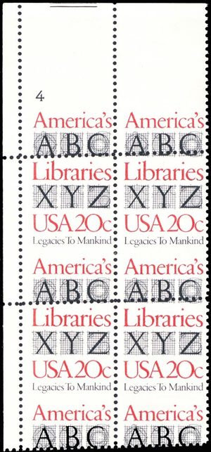 2015, Large Misperforated ERROR 20¢ Libraries Plate Block MNH - Stuart Katz