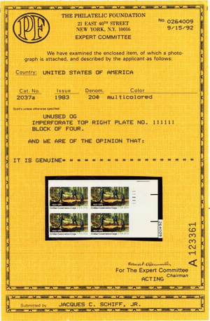 Due to the high cost of obtaining certificates we will only refund the cost of the stamp and not the cost of the certificate for stamps that sell for less than $250 that come back with a negative certificate. Stamps that sell for above $250 will receive a full refund for both the price of the stamp and cost of the certificate if it should come back not as described. For U.S. stamps only certificates from either APS, PSE or from the Philatelic Foundation are accepted, however "graded" certificates or "encased" items are not accepted.