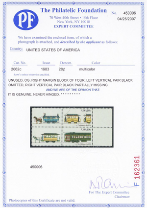 Due to the high cost of obtaining certificates we will only refund the cost of the stamp and not the cost of the certificate for stamps that sell for less than $250 that come back with a negative certificate. Stamps that sell for above $250 will receive a full refund for both the price of the stamp and cost of the certificate if it should come back not as described. For U.S. stamps only certificates from either APS, PSE or from the Philatelic Foundation are accepted, however "graded" certificates or "encased" items are not accepted.