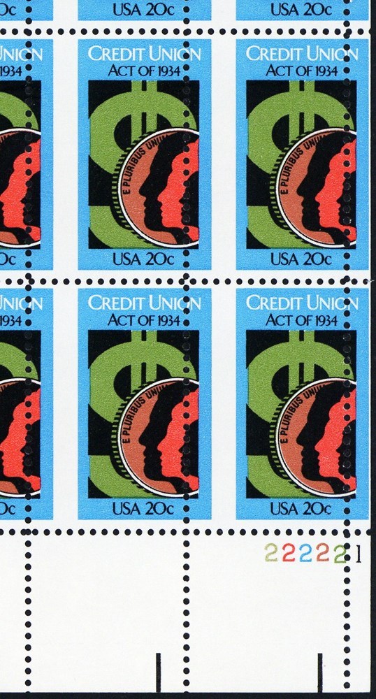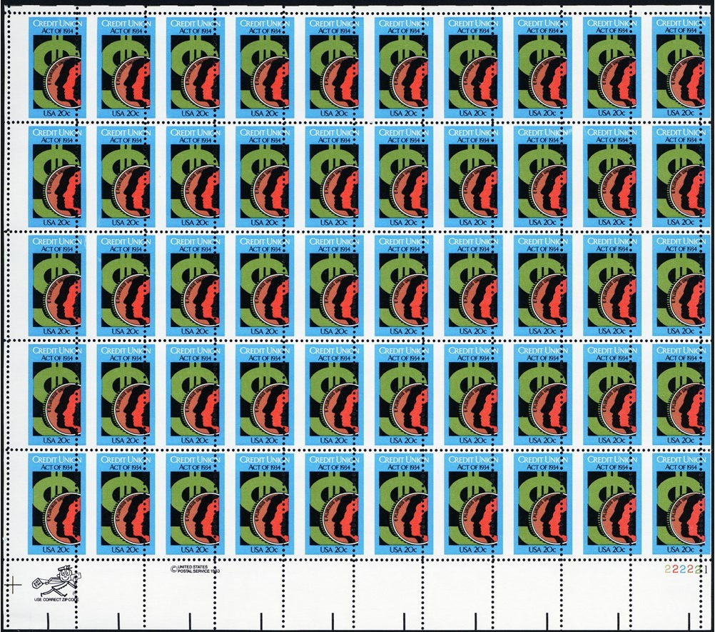 2075, RARE ERROR Sheet of 50 20¢ Stamps Credit Union Mint NH - Stuart Katz