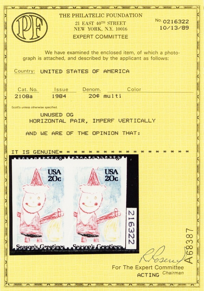 Due to the high cost of obtaining certificates we will only refund the cost of the stamp and not the cost of the certificate for stamps that sell for less than $250 that come back with a negative certificate. Stamps that sell for above $250 will receive a full refund for both the price of the stamp and cost of the certificate if it should come back not as described. For U.S. stamps only certificates from either APS, PSE or from the Philatelic Foundation are accepted, however "graded" certificates or "encased" items are not accepted.