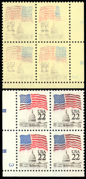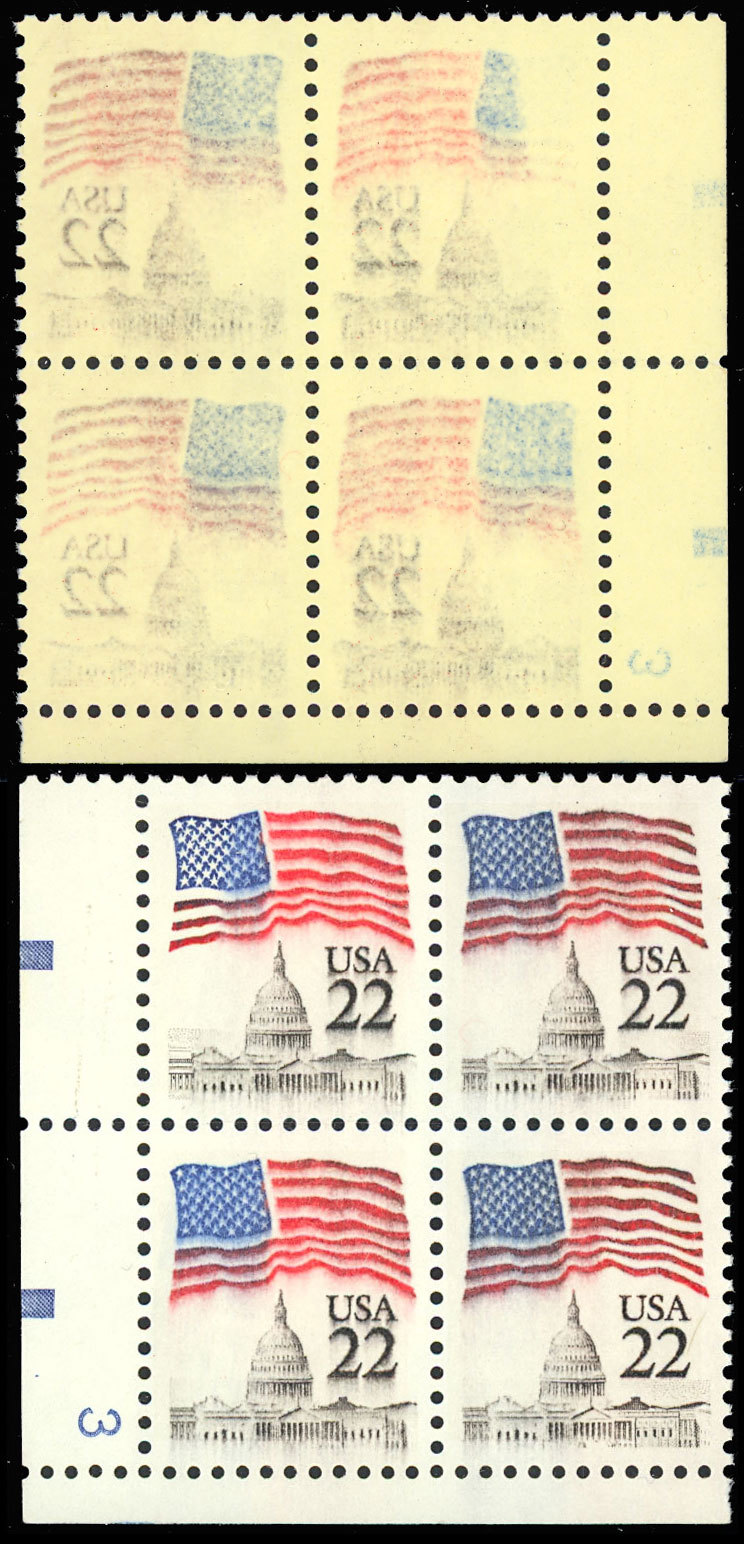 2114 22c Flag - Reverse printing on back ERROR PL# Block of Four - Stuart Katz