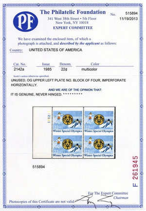 Due to the high cost of obtaining certificates we will only refund the cost of the stamp and not the cost of the certificate for stamps that sell for less than $250 that come back with a negative certificate. Stamps that sell for above $250 will receive a full refund for both the price of the stamp and cost of the certificate if it should come back not as described. For U.S. stamps only certificates from either APS, PSE or from the Philatelic Foundation are accepted, however "graded" certificates or "encased" items are not accepted.