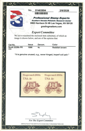 2228b, 4¢ Stagecoach Imperf Pair, Mint NH, PSE Certificate, Scott $175