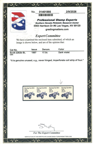 2262b, Imperf 17.5¢ Racing Car Pair, Mint NH, PSE Certificate, Scott $1000
