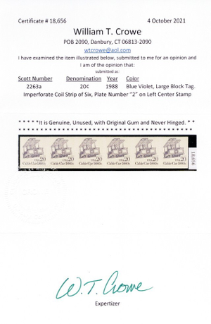2263a, Mint NH VF 20¢ Imperforate Coil Pl# 2 Strip Error W/Cert - Stuart Katz