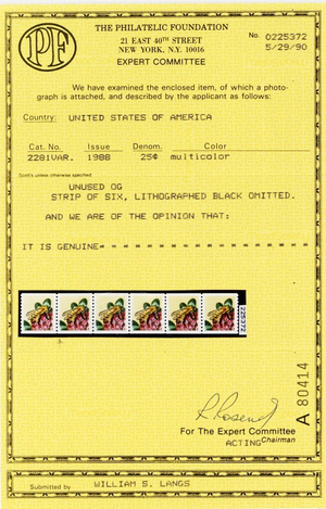 Due to the high cost of obtaining certificates we will only refund the cost of the stamp and not the cost of the certificate for stamps that sell for less than $250 that come back with a negative certificate. Stamps that sell for above $250 will receive a full refund for both the price of the stamp and cost of the certificate if it should come back not as described. For U.S. stamps only certificates from either APS, PSE or from the Philatelic Foundation are accepted, however "graded" certificates or "encased" items are not accepted.