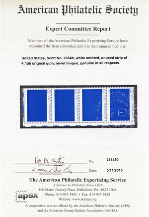 Due to the high cost of obtaining certificates we will only refund the cost of the stamp and not the cost of the certificate for stamps that sell for less than $250 that come back with a negative certificate. Stamps that sell for above $250 will receive a full refund for both the price of the stamp and cost of the certificate if it should come back not as described. For U.S. stamps only certificates from either APS, PSE or from the Philatelic Foundation are accepted, however "graded" certificates or "encased" items are not accepted.