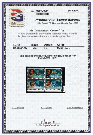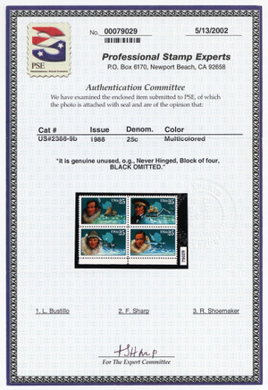 2389b, Mint NH 25¢ Black Colors Omitted Block Error With PSE Cert - Stuart Katz