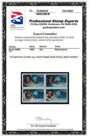 2389b, MNH 25¢ Black Color Omitted Error Block PSE Cert - Stuart Katz
