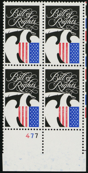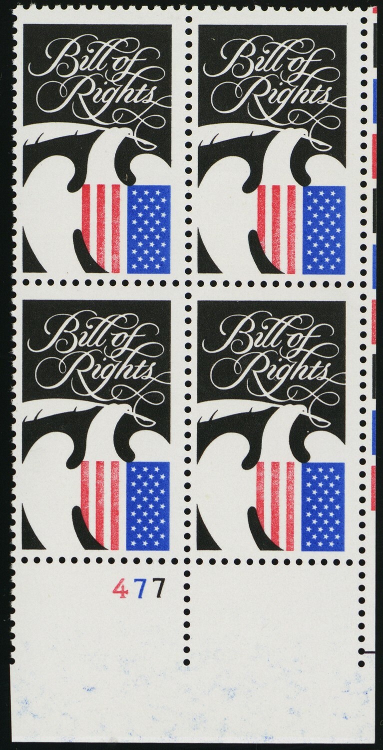 2421a, MNH 25¢ Bill of Rights Black Color Omitted ERROR Plate Block Stuart Katz