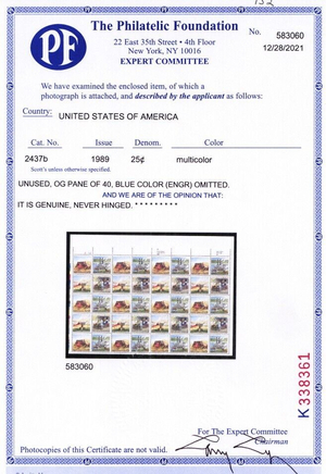 2437b, MNH 25¢ Dark Blue Omitted Error Pane of 40 Errors PFC Cert - Stuart Katz