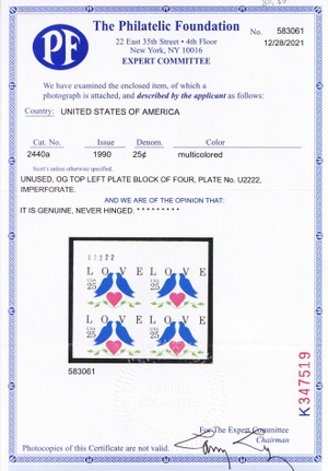 Due to the high cost of obtaining certificates we will only refund the cost of the stamp and not the cost of the certificate for stamps that sell for less than $250 that come back with a negative certificate. Stamps that sell for above $250 will receive a full refund for both the price of the stamp and cost of the certificate if it should come back not as described. For U.S. stamps only certificates from either APS, PSE or from the Philatelic Foundation are accepted, however "graded" certificates or "encased" items are not accepted.