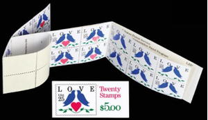 25¢ Love, booklet pane of 10, bright pink omitted (Scott 2441c var.), right six stamps on transitional second pane of complete unexploded booklet (first pane normal), o.g., never hinged, Post Office fresh, the bright pink fading on positions 2 and 7, Very Fine, only 20 panes reported. Scott $480 as six singles.