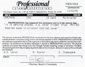 Due to the high cost of obtaining certificates we will only refund the cost of the stamp and not the cost of the certificate for stamps that sell for less than $250 that come back with a negative certificate. Stamps that sell for above $250 will receive a full refund for both the price of the stamp and cost of the certificate if it should come back not as described. For U.S. stamps only certificates from either APS, PSE or from the Philatelic Foundation are accepted, however "graded" certificates or "encased" items are not accepted.