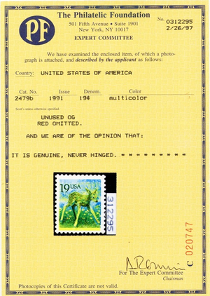 Due to the high cost of obtaining certificates we will only refund the cost of the stamp and not the cost of the certificate for stamps that sell for less than $250 that come back with a negative certificate. Stamps that sell for above $250 will receive a full refund for both the price of the stamp and cost of the certificate if it should come back not as described. For U.S. stamps only certificates from either APS, PSE or from the Philatelic Foundation are accepted, however "graded" certificates or "encased" items are not accepted.