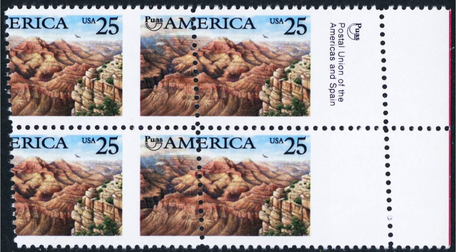2512, MNH AMERICA 25¢ Perfs Shifted Freaky Error Margin Block * Stuart Katz
