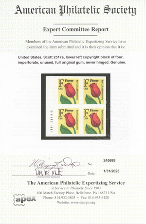 2517a, MNH Imperforate "F" Stamp Block With APS Certificate - Stuart Katz