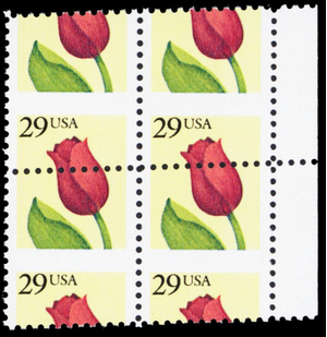 2524, MNH 29¢ Misperf Shift Freak Error Block of Tulip Stamps -- Stuart Katz