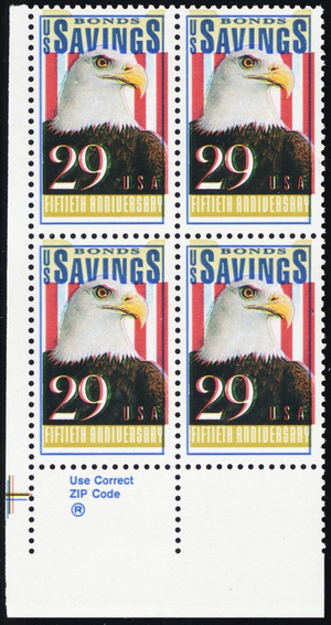 2534, MNH 29¢ Savings Bond - Fantastic Color Shift Error Zip Block - Stuart Katz