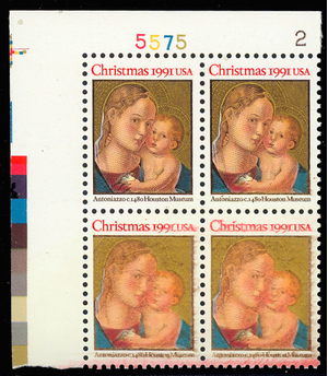2578 Solvent Smear ERROR PL# Block of Four 29¢ Christmas - Stuart Katz