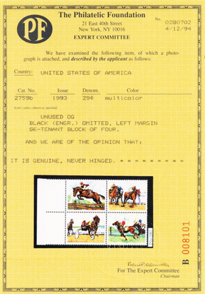 Due to the high cost of obtaining certificates we will only refund the cost of the stamp and not the cost of the certificate for stamps that sell for less than $250 that come back with a negative certificate. Stamps that sell for above $250 will receive a full refund for both the price of the stamp and cost of the certificate if it should come back not as described. For U.S. stamps only certificates from either APS, PSE or from the Philatelic Foundation are accepted, however "graded" certificates or "encased" items are not accepted.