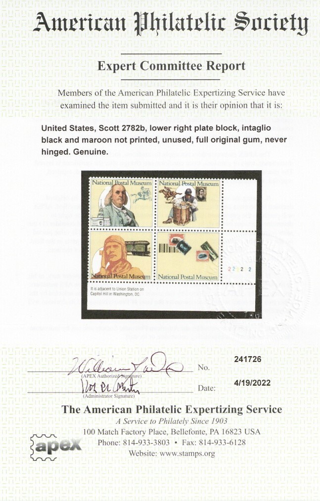 2782b, MNH 29¢ Black & Maroon Colors Omitted Error With APS Cert - Stuart Katz