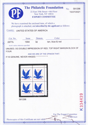 2877b, MNH Double Impression of Red Color Block PFC Certificate - Stuart Katz