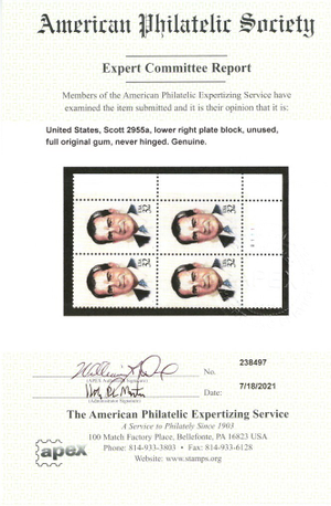 Due to the high cost of obtaining certificates we will only refund the cost of the stamp and not the cost of the certificate for stamps that sell for less than $250 that come back with a negative certificate. Stamps that sell for above $250 will receive a full refund for both the price of the stamp and cost of the certificate if it should come back not as described. For U.S. stamps only certificates from either APS, PSE or from the Philatelic Foundation are accepted, however "graded" certificates or "encased" items are not accepted.