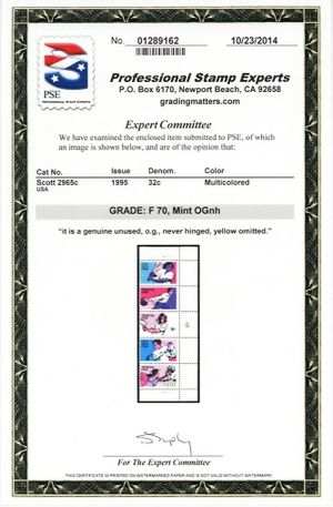 Due to the high cost of obtaining certificates we will only refund the cost of the stamp and not the cost of the certificate for stamps that sell for less than $250 that come back with a negative certificate. Stamps that sell for above $250 will receive a full refund for both the price of the stamp and cost of the certificate if it should come back not as described. For U.S. stamps only certificates from either APS, PSE or from the Philatelic Foundation are accepted, however "graded" certificates or "encased" items are not accepted.