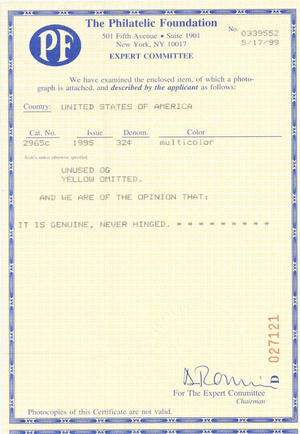 Due to the high cost of obtaining certificates we will only refund the cost of the stamp and not the cost of the certificate for stamps that sell for less than $250 that come back with a negative certificate. Stamps that sell for above $250 will receive a full refund for both the price of the stamp and cost of the certificate if it should come back not as described. For U.S. stamps only certificates from either APS, PSE or from the Philatelic Foundation are accepted, however "graded" certificates or "encased" items are not accepted.